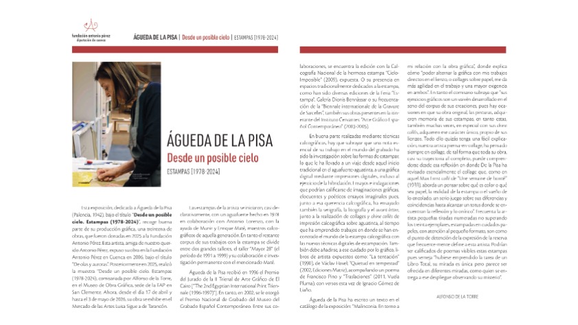 From April 17th to May 3rd, El Mercado de las Artes in the Townhall of Tarancón will host Águeda de la Pisa’s exhibition Desde un posible cielo. Estampas 1978-2024, curated by Alfonso de la Torre.